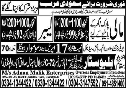 Mali and Labor Jobs 2023 in Saudi Arabia KSA announce the Contract career opportunities for the post of See Below Ad in Saudi Arabia for the fresh and experienced candidates on Contract basis who have Check Advertisement degree. Posted date of this post is 16/04/2023 and the last date is 17/04/2023. if you are eligible for this job apply before due date.
