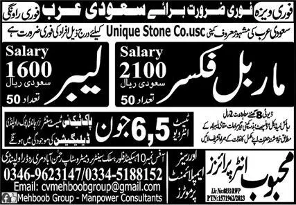 Marble Fixer & Labor Jobs 2023 In Saudi Arabia announce the Contract career opportunities for the post of See Below Ad in Saudi Arabia for the fresh and experienced candidates on Contract basis who have Check Advertisement degree. Posted date of this post is 30/05/2023 and the last date is 06/06/2023. if you are eligible for this job apply before due date.