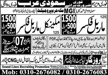 Marble Fixer & Mechanical Marble Fixer Jobs 2025 announce the Contract career opportunities for the post of See Below Ad in Saudi Arabia for the fresh and experienced candidates on Contract basis who have Check Advertisement degree. Posted date of this post is 02/08/2025 and the last date is 07/08/2025. if you are eligible for this job apply before due date.