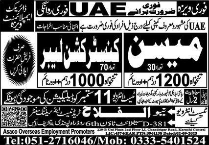 Mason And Construction Labours Jobs In United Arab Emirates announce the Contract career opportunities for the post of See Below Ad in United Arab Emirates for the fresh and experienced candidates on Contract basis who have Check Advertisement degree. Posted date of this post is 10/12/2025 and the last date is 11/12/2025. if you are eligible for this job apply before due date.