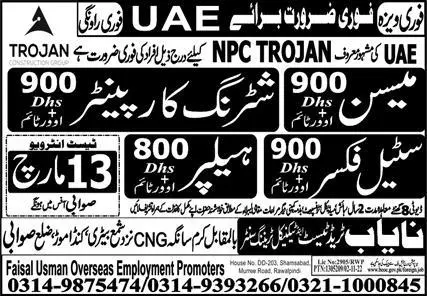 Mason and Helper jobs in UAE 2023 announce the Contract career opportunities for the post of See Below Ad in United Arab Emirates for the fresh and experienced candidates on Contract basis who have Check Advertisement degree. Posted date of this post is 10/03/2023 and the last date is 13/03/2023. if you are eligible for this job apply before due date.