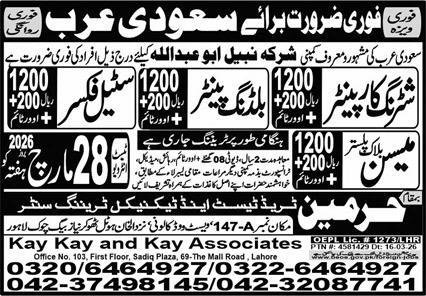 Mason & Block Mason Jobs 2026 In Saudi Arabia announce the Contract career opportunities for the post of See Below Ad in Saudi Arabia for the fresh and experienced candidates on Contract basis who have Check Advertisement degree. Posted date of this post is 26/03/2026 and the last date is 28/03/2026. if you are eligible for this job apply before due date.