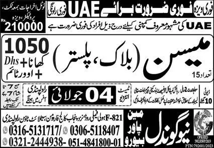 Mason Block Plaster Jobs In Dubai UAE 2023 announce the Contract career opportunities for the post of See Below Ad in United Arab Emirates for the fresh and experienced candidates on Contract basis who have Check Advertisement degree. Posted date of this post is 02/07/2023 and the last date is 04/07/2023. if you are eligible for this job apply before due date.