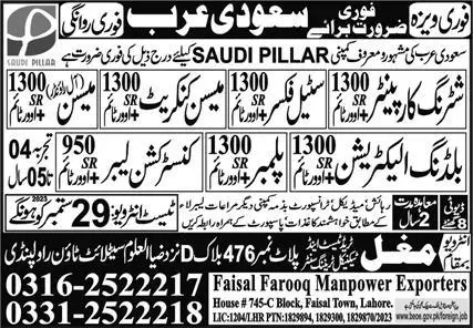 Mason Concrete & Construction Labor Jobs 2023 Saudi Arabia announce the Contract career opportunities for the post of See Below Ad in Saudi Arabia for the fresh and experienced candidates on Contract basis who have Check Advertisement degree. Posted date of this post is 23/09/2023 and the last date is 29/09/2023. if you are eligible for this job apply before due date.