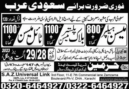 Mason Helper & Plaster Mason Jobs 2023 In Saudi Arabia announce the Contract career opportunities for the post of See Below Ad in Saudi Arabia for the fresh and experienced candidates on Contract basis who have Check Advertisement degree. Posted date of this post is 09/08/2023 and the last date is 29/08/2023. if you are eligible for this job apply before due date.