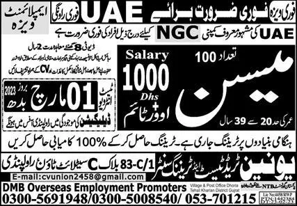 DMB Overseas Employment Promoters invites applications for job positions advertised in daily Express dated 27 February 2023 for following vacancies in UAE, uae UAE. mason