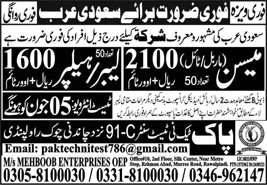 Mason & Labor Jobs In Saudi Arabia 2023 announce the Contract career opportunities for the post of See Below Ad in Saudi Arabia for the fresh and experienced candidates on Contract basis who have Check Advertisement degree. Posted date of this post is 04/06/2023 and the last date is 05/06/2023. if you are eligible for this job apply before due date.