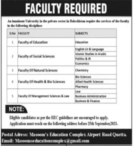 Masoom Educational Complex Quetta Jobs 2023 announce the Contract career opportunities for the post of See Below Ad in Balochistan, Quetta for the fresh and experienced candidates on Contract basis who have Check Advertisement degree. Posted date of this post is 15/09/2023 and the last date is 25/09/2023. if you are eligible for this job apply before due date.