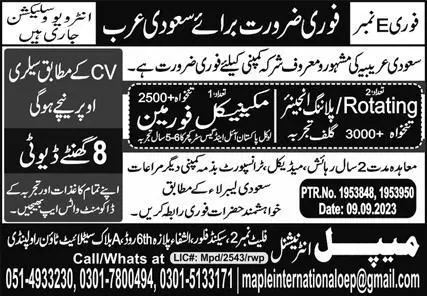 Mechanical Foreman & Rotating EngineerSaudi Arabia Jobs announce the Contract career opportunities for the post of See Below Ad in Saudi Arabia for the fresh and experienced candidates on Contract basis who have Check Advertisement degree. Posted date of this post is 11/10/2023 and the last date is 18/10/2023. if you are eligible for this job apply before due date.