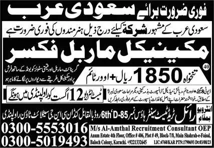 Mechanical Marble Fixer Jobs 2023 In Saudi Arabia announce the Contract career opportunities for the post of See Below Ad in Saudi Arabia for the fresh and experienced candidates on Contract basis who have Check Advertisement degree. Posted date of this post is 05/08/2023 and the last date is 12/08/2023. if you are eligible for this job apply before due date.