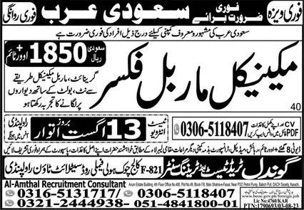 Mechanical Marble Fixer Jobs 2023 In Saudi Arabia announce the Contract career opportunities for the post of See Below Ad in Saudi Arabia for the fresh and experienced candidates on Contract basis who have Check Advertisement degree. Posted date of this post is 10/08/2023 and the last date is 13/08/2023. if you are eligible for this job apply before due date.