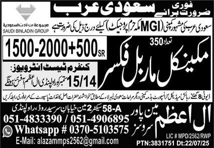 Mechanical Marble Fixer Jobs Open In Saudi Arabia 2025 announce the Contract career opportunities for the post of See Below Ad in Saudi Arabia for the fresh and experienced candidates on Contract basis who have Check Advertisement degree. Posted date of this post is 11/09/2025 and the last date is 15/09/2025. if you are eligible for this job apply before due date.