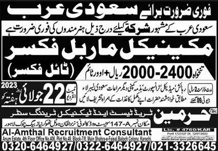 Mechanical Marble Fixer & Tile Fixer Jobs 2023 Saudi Arabia announce the Contract career opportunities for the post of See Below Ad in Saudi Arabia for the fresh and experienced candidates on Contract basis who have Check Advertisement degree. Posted date of this post is 19/07/2023 and the last date is 22/07/2023. if you are eligible for this job apply before due date.