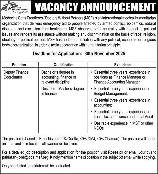 Medecins Sans Frontieres MSF Pakistan Jobs 2025 announce the Contract career opportunities for the post of See Below Ad in Balochistan, Quetta for the fresh and experienced candidates on Contract basis who have Check Advertisement degree. Posted date of this post is 21/11/2025 and the last date is 30/11/2025. if you are eligible for this job apply before due date.