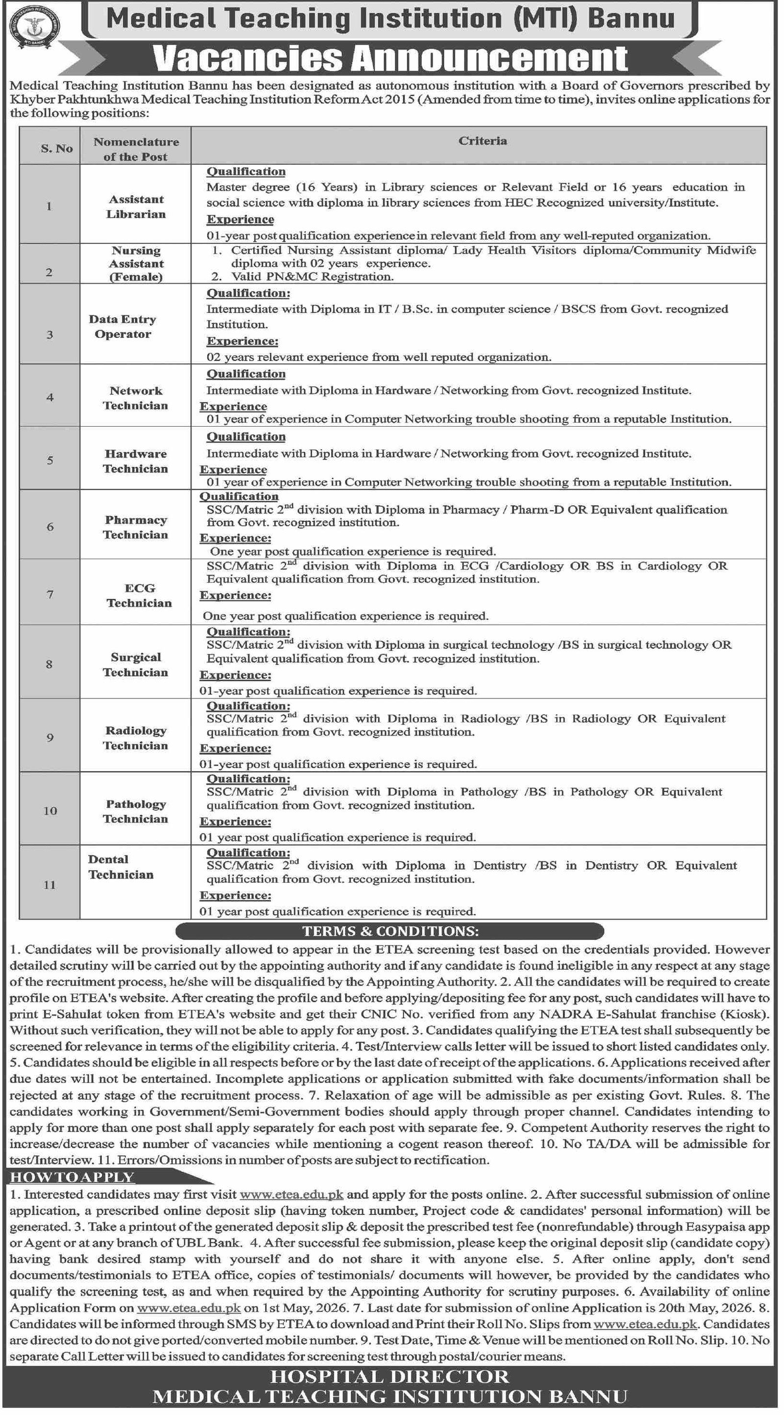 Medical Teaching Institution MTI Bannu Jobs 2026 announce the Contract career opportunities for the post of See Below Ad in Khyber Pakhtunkhwa, Bannu for the fresh and experienced candidates on Contract basis who have Check Advertisement degree. Posted date of this post is 23/04/2026 and the last date is 07/05/2026. if you are eligible for this job apply before due date.
