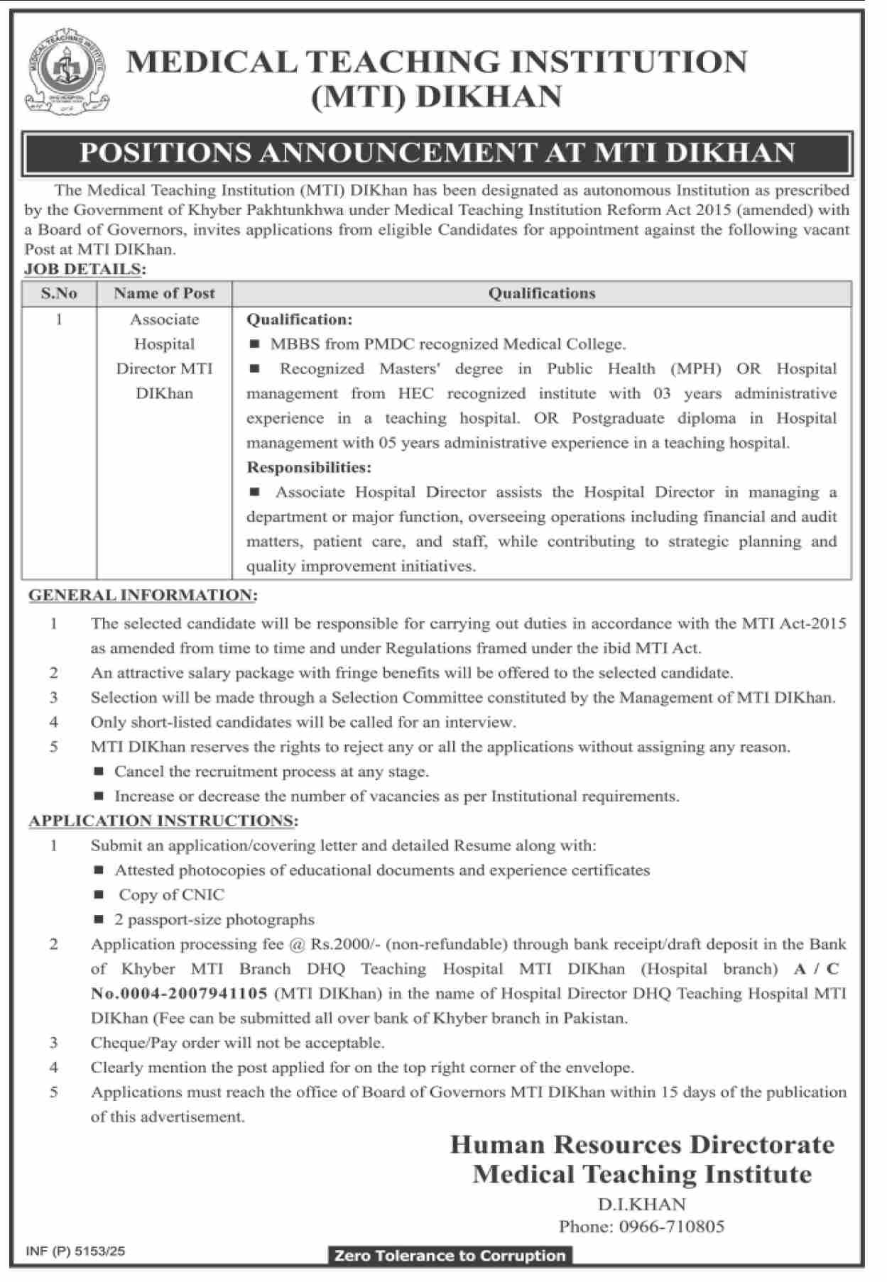 Medical Teaching Institution MTI DIKhan Jobs 2025 announce the Contract career opportunities for the post of See Below Ad in Khyber Pakhtunkhwa, Dera Ismail Khan for the fresh and experienced candidates on Contract basis who have Check Advertisement degree. Posted date of this post is 06/12/2025 and the last date is 21/12/2025. if you are eligible for this job apply before due date.