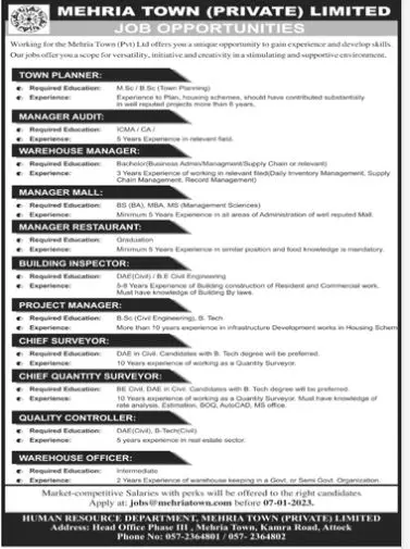 - Mehria Town Private Limited is looking for candidates for following posts as per job advertisement published in daily Jang Newspaper of January 1, 2023 for location Attock, attock Punjab Pakistan: