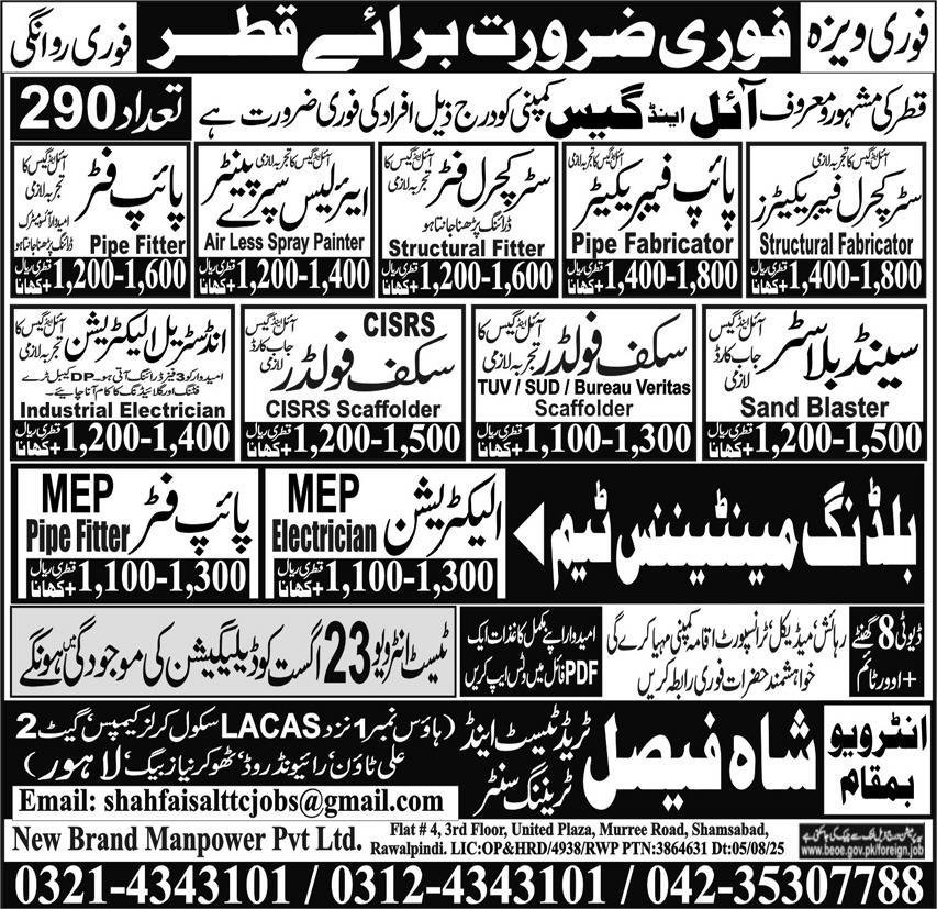 MEP Electrician & Sand Blaster Jobs 2025 In Qatar announce the Contract career opportunities for the post of See Below Ad in Qatar for the fresh and experienced candidates on Contract basis who have Check Advertisement degree. Posted date of this post is 20/08/2025 and the last date is 23/08/2025. if you are eligible for this job apply before due date.