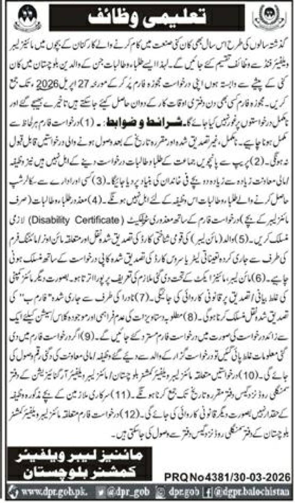Mines Labour Welfare Commissioner Balochistan scholarships announce the Contract career opportunities for the post of See Below Ad in Balochistan, Quetta for the fresh and experienced candidates on Contract basis who have Check Advertisement degree. Posted date of this post is 01/04/2026 and the last date is 27/04/2026. if you are eligible for this job apply before due date.