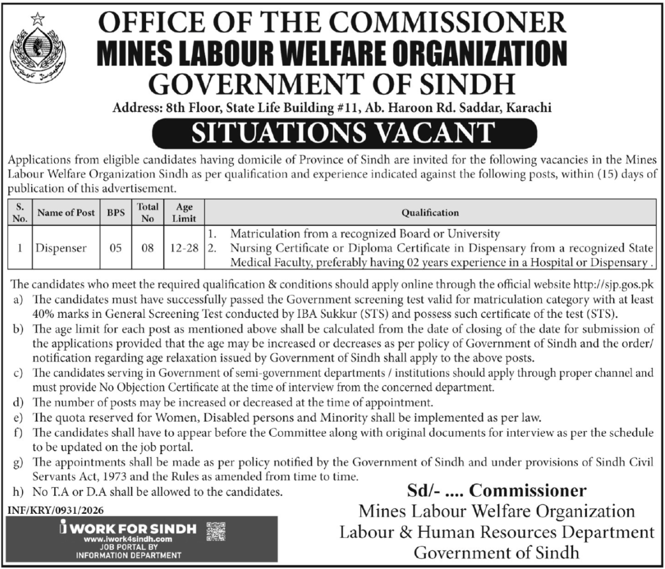 Mines Labour Welfare Organization Sindh Jobs 2026 announce the Contract career opportunities for the post of See Below Ad in Sindh, Karachi for the fresh and experienced candidates on Contract basis who have Check Advertisement degree. Posted date of this post is 06/03/2026 and the last date is 21/03/2026. if you are eligible for this job apply before due date.
