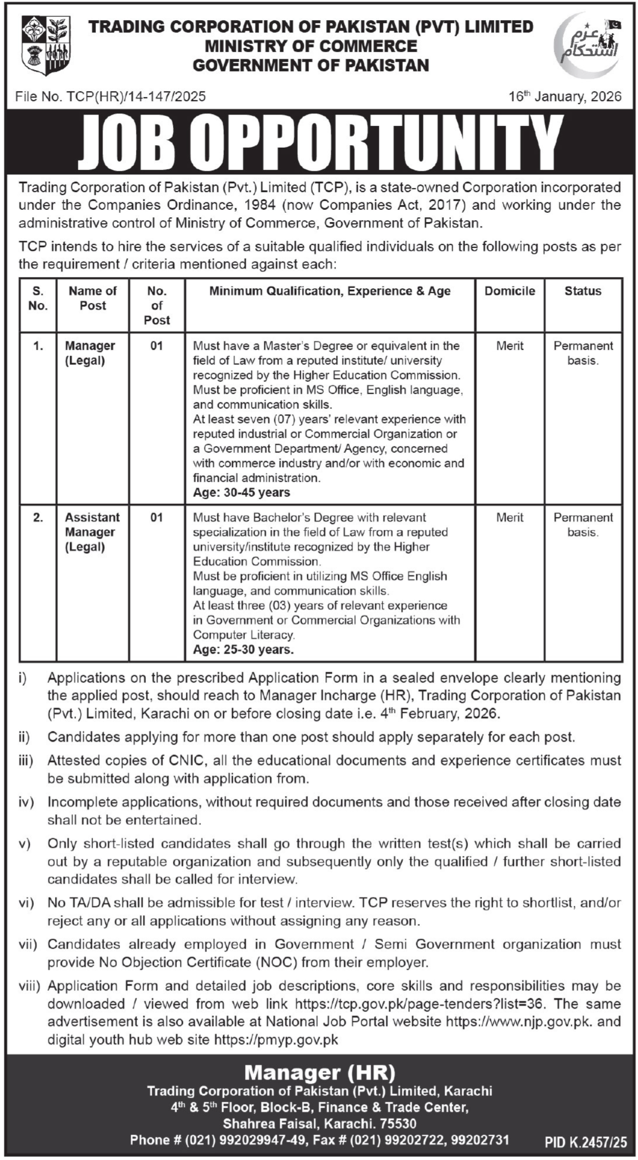 i) Applications on the prescribed Application Form in a sealed envelope clearly mentioning the applied post, should reach to Manager Incharge (HR), Trading Corporation of Pakistan (Pvt.) Limited, Karachi on or before closing date i.e. 4th February, 2026.
