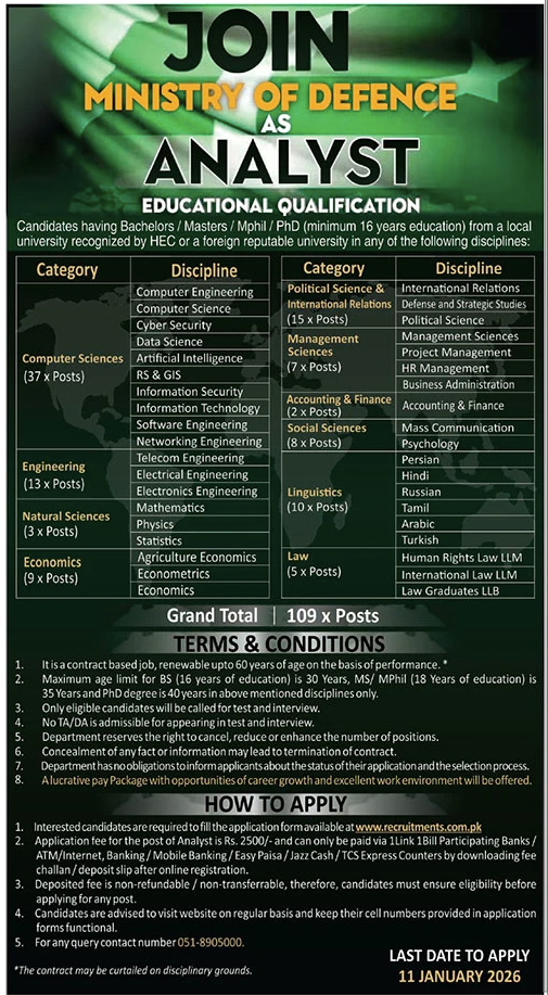 Ministry of Defence As anaylist Jobs 2025 announce the Contract career opportunities for the post of See Below Ad in Federal, Islamabad for the fresh and experienced candidates on Contract basis who have Check Advertisement degree. Posted date of this post is 21/12/2025 and the last date is 11/01/2026. if you are eligible for this job apply before due date.