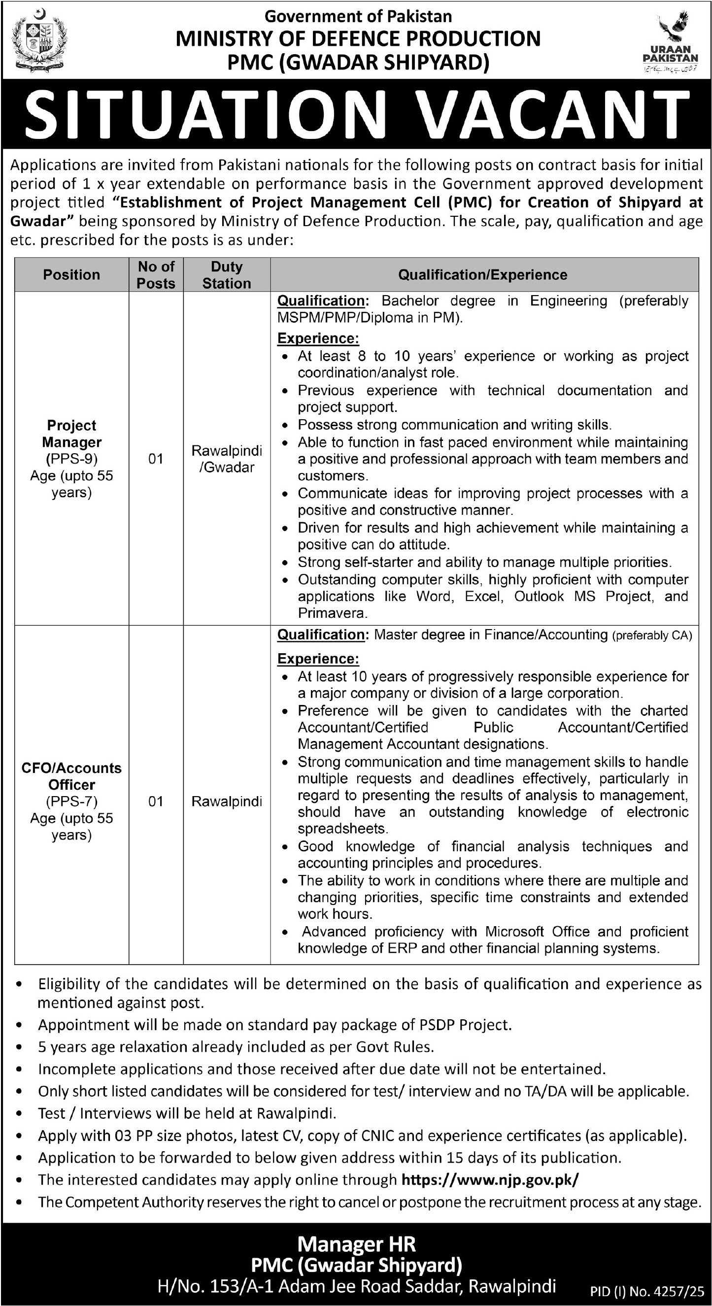 Applications are invited from Pakistani nationals for the following posts on contract basis for initial period of 1 x year extendable on performance basis in the Government approved development project titled "Establishment of Project Management Cell (PMC) for Creation of Shipyard at Gwadar" being sponsored by Ministry of Defence Production. The scale, pay, qualification and age etc. prescribed for the posts is as under: