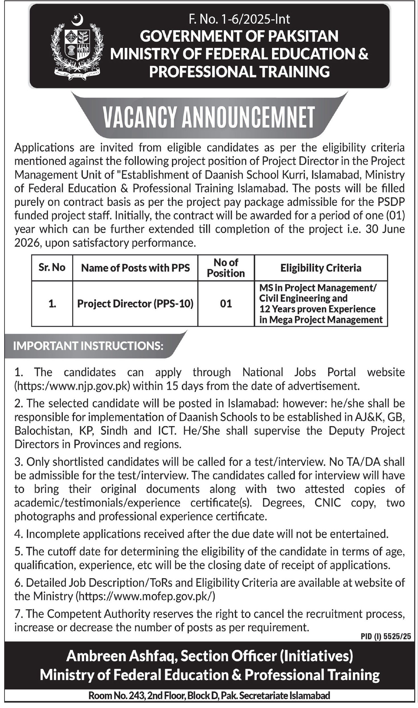 Applications are invited from eligible candidates as per the eligibility criteria mentioned against the following project position of Project Director in the Project Management Unit of "Establishment of Daanish School Kurri, Islamabad, Ministry of Federal Education & Professional Training Islamabad. The posts will be filled purely on contract basis as per the project pay package admissible for the PSDP funded project staff. Initially, the contract will be awarded for a period of one (01) year which can be further extended till completion of the project i.e. 30 June 2026, upon satisfactory performance.