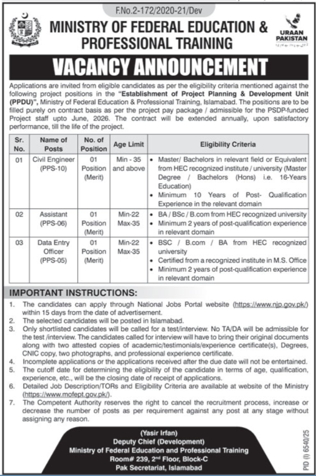 Applications are invited from eligible candidates as per the eligibility criteria mentioned against the following project positions in the "Establishment of Project Planning & Development Unit (PPDU)", Ministry of Federal Education & Professional Training, Islamabad. The positions are to be filled purely on contract basis as per the project pay package/admissible for the PSDP-funded Project staff upto June, 2026. The contract will be extended annually, upon satisfactory performance, till the life of the project.