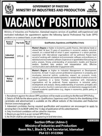 Ministry of Industries And Producation Islambad Jobs 2025 announce the Contract career opportunities for the post of See Below Ad in Federal, Islamabad for the fresh and experienced candidates on Contract basis who have Check Advertisement degree. Posted date of this post is 10/09/2025 and the last date is 25/09/2025. if you are eligible for this job apply before due date.