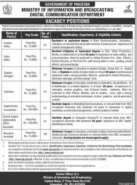 Ministry Of Information And Broadcasting Islamabad Jobs 2025 announce the Contract career opportunities for the post of See Below Ad in Federal, Islamabad for the fresh and experienced candidates on Contract basis who have Check Advertisement degree. Posted date of this post is 07/12/2025 and the last date is 21/12/2025. if you are eligible for this job apply before due date.