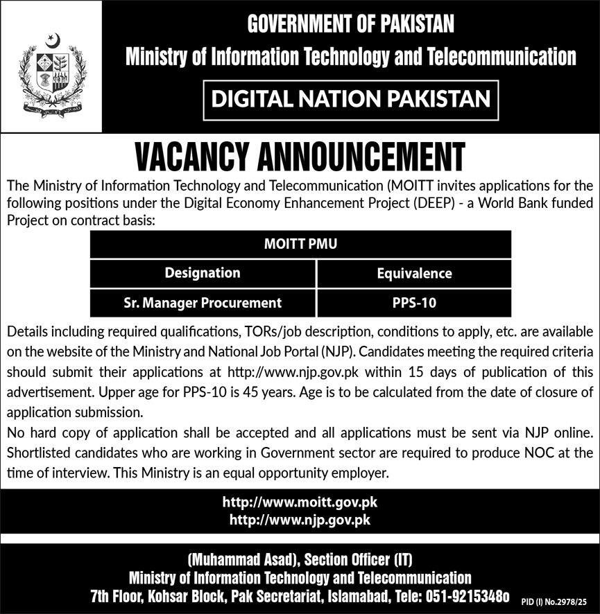 Ministry Of Information Technology & Telecommunication Jobs announce the Contract career opportunities for the post of See Below Ad in Federal, Islamabad for the fresh and experienced candidates on Contract basis who have Check Advertisement degree. Posted date of this post is 10/10/2025 and the last date is 24/10/2025. if you are eligible for this job apply before due date.