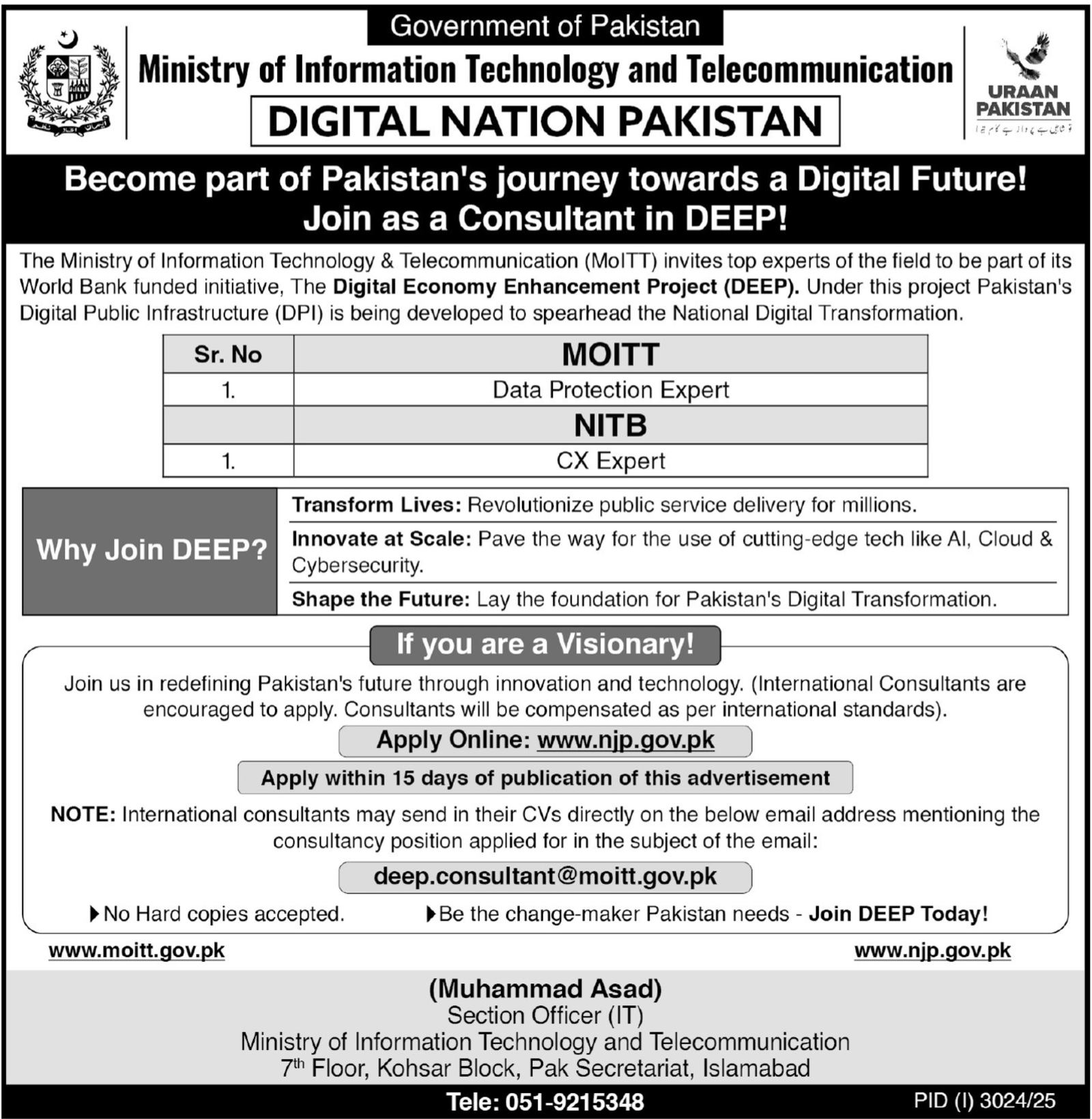 The Ministry of Information Technology & Telecommunication (MoITT) invites top experts of the field to be part of its World Bank funded initiative, The Digital Economy Enhancement Project (DEEP). Under this project Pakistan's Digital Public Infrastructure (DPI) is being developed to spearhead the National Digital Transformation.
