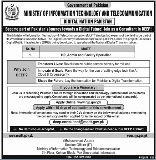 The Ministry of Information Technology & Telecommunication (MoITT) invites top experts of the field to be part of its World Bank funded initiative, The Digital Economy Enhancement Project (DEEP). Under this project Pakistan's Digital Public Infrastructure (DPI) is being developed to spearhead the National Digital Transformation.