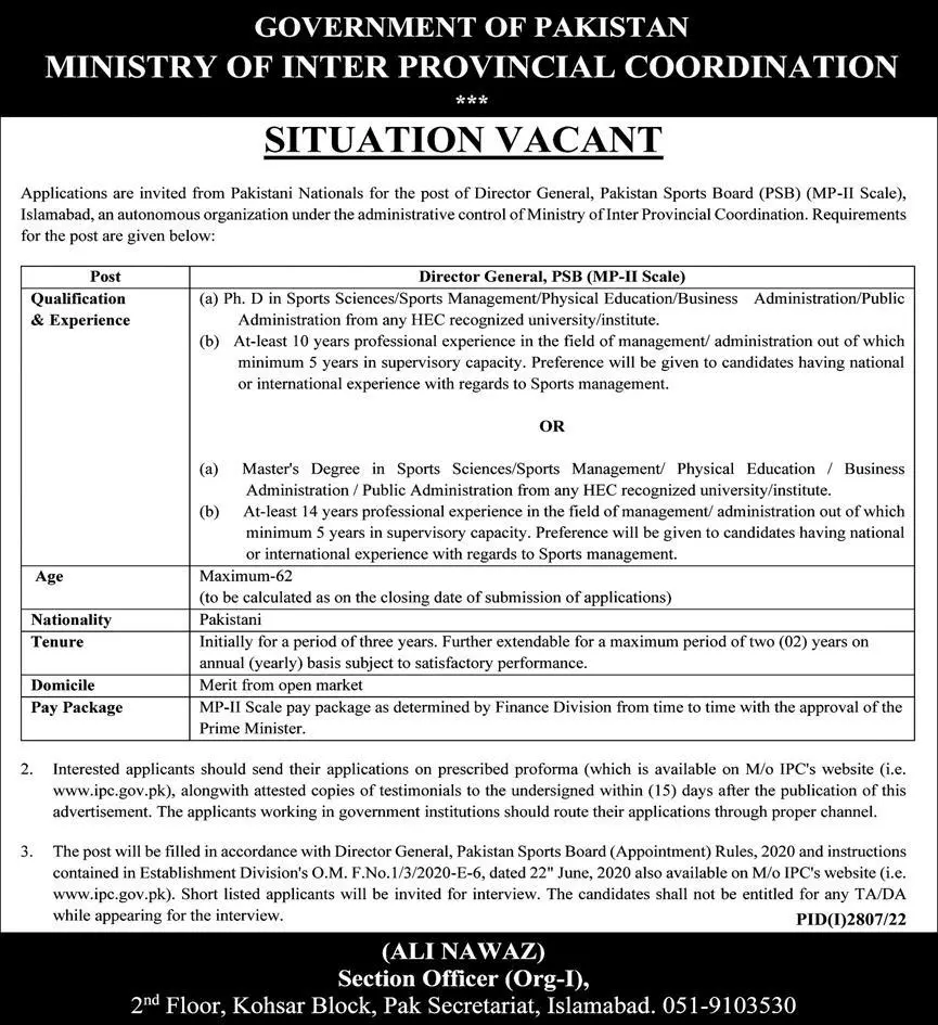 Ministry of Inter Provincial Coordination is looking for candidates for following posts as per job advertisement published in daily The News Newspaper of November 5, 2022 for location Islamabad, islamabad Islamabad Pakistan: director general psb Preferred Education is Master and Phd etc.