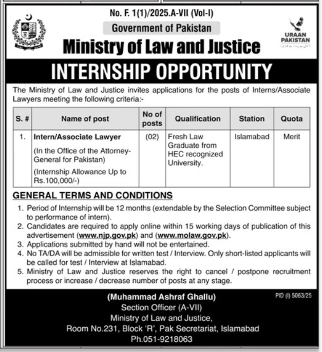 Ministry Of Law & Justice Internship Opportunity 2026 announce the Contract career opportunities for the post of See Below Ad in Federal, Islamabad for the fresh and experienced candidates on Contract basis who have Check Advertisement degree. Posted date of this post is 20/12/2025 and the last date is 03/01/2026. if you are eligible for this job apply before due date.