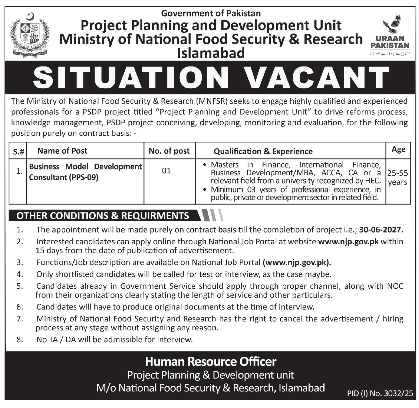 The Ministry of National Food Security & Research (MNFSR) seeks to engage highly qualified and experienced professionals for a PSDP project titled "Project Planning and Development Unit" to drive reforms process, knowledge management, PSDP project conceiving, developing, monitoring and evaluation, for the following position purely on contract basis: -