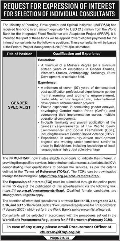 The Ministry of Planning, Development and Special Initiatives (MoPD&SI) has received financing in an amount equivalent to USD 213 million from the World Bank for the Integrated Flood Resilience and Adaptation Project (IFRAP). It is intended that part of these funds will be applied toward eligible payments for the hiring of consultants for the following positions. These consultants will be based at the Federal Project Management Unit (FPMU) in Islamabad.