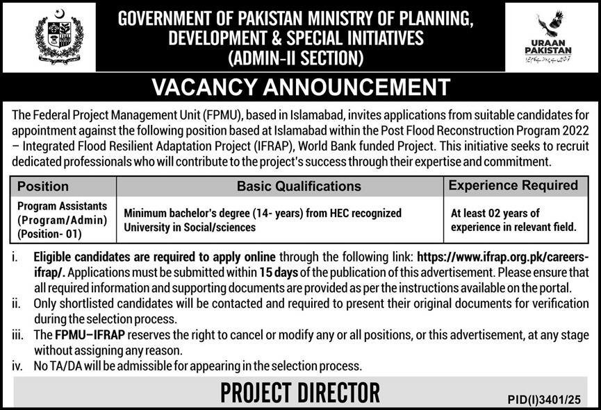 The Federal Project Management Unit (FPMU), based in Islamabad, invites applications from suitable candidates for appointment against the following position based at Islamabad within the Post Flood Reconstruction Program 2022 - Integrated Flood Resilient Adaptation Project (IFRAP), World Bank funded Project. This initiative seeks to recruit dedicated professionals who will contribute to the project's success through their expertise and commitment.