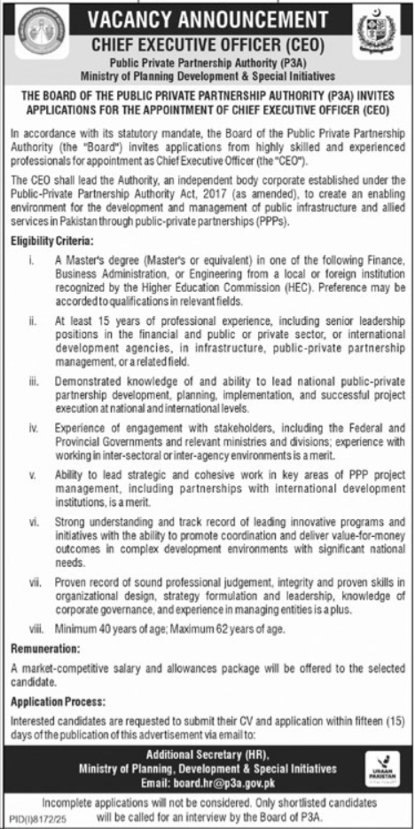Ministry Of Planning Development & Special Initiatives Jobs announce the Contract career opportunities for the post of See Below Ad in Federal, Islamabad for the fresh and experienced candidates on Contract basis who have Check Advertisement degree. Posted date of this post is 09/04/2026 and the last date is 23/04/2026. if you are eligible for this job apply before due date.