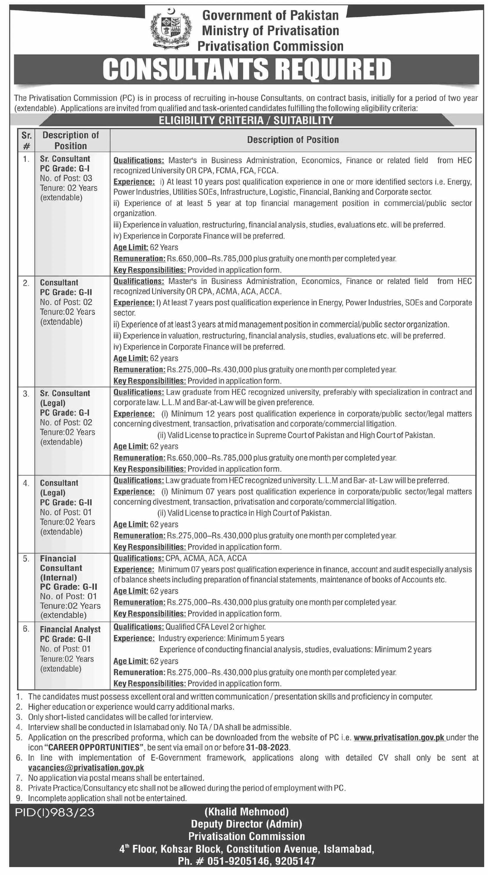 Ministry Of Privatisation Commission Islamabad Jobs 2023 announce the Contract career opportunities for the post of See Below Ad in Federal, Islamabad for the fresh and experienced candidates on Contract basis who have Check Advertisement degree. Posted date of this post is 12/08/2023 and the last date is 31/08/2023. if you are eligible for this job apply before due date.