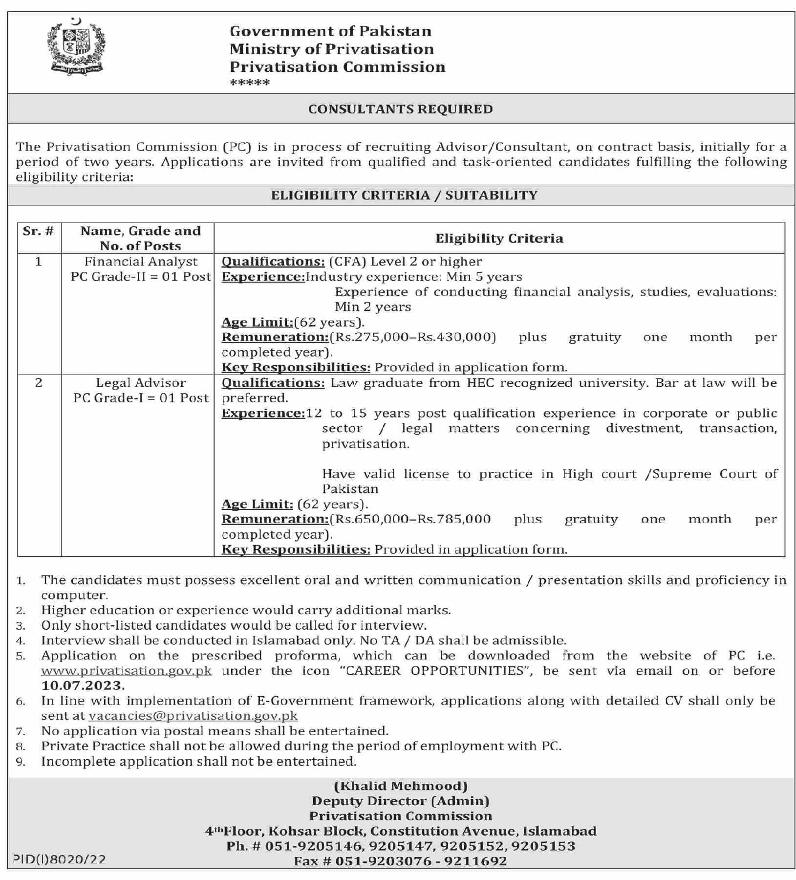 Ministry of Privatisation Islamabad Jobs 2023 announce the Contract career opportunities for the post of See Below Ad in Federal,Islamabad for the fresh and experienced candidates on Contract basis who have Check Advertisement degree. Posted date of this post is 24/06/2023 and the last date is 10/07/2023. if you are eligible for this job apply before due date.