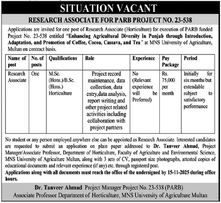 Applications are invited for one post of Research Associate (Horticulture) for execution of PARB funded Project No. 23-538 entitled “Enhancing Agricultural Diversity in Punjab through Introduction, Adaptation, and Promotion of Coffee, Cocoa, Cassava, and Tea” at MNS University of Agriculture, Multan on contract basis.