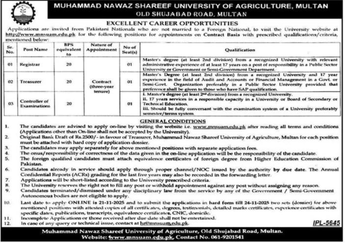 Muhammad Nawaz Shareef University Of Agriculture Multan Jobs announce the Contract career opportunities for the post of See Below Ad in Punjab, Multan for the fresh and experienced candidates on Contract basis who have Check Advertisement degree. Posted date of this post is 30/10/2025 and the last date is 21/11/2025. if you are eligible for this job apply before due date.