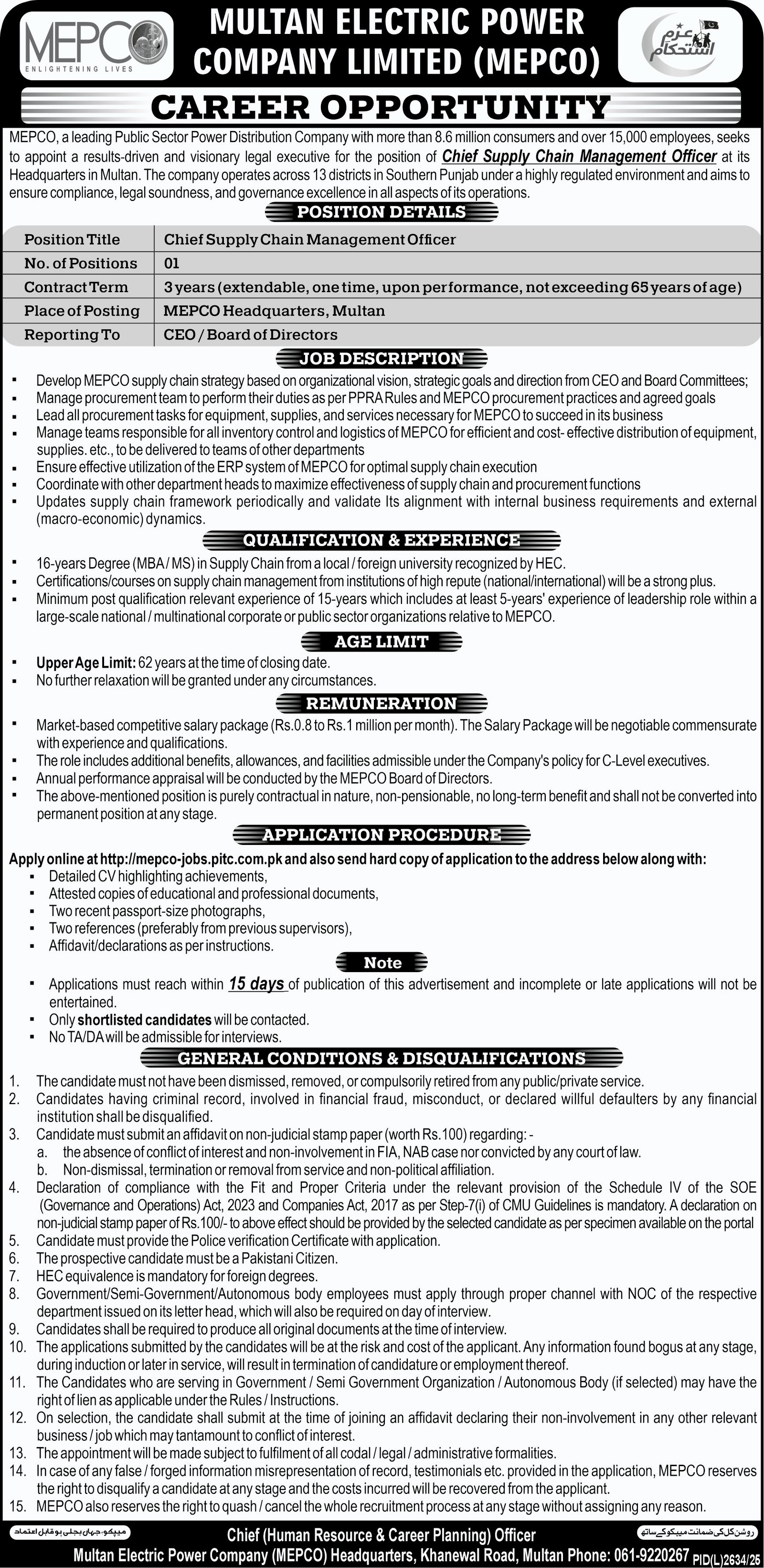 Multan Electric Power Company MEPCO Multan Jobs 2026 announce the Contract career opportunities for the post of See Below Ad in Punjab, Multan for the fresh and experienced candidates on Contract basis who have Check Advertisement degree. Posted date of this post is 29/03/2026 and the last date is 13/04/2026. if you are eligible for this job apply before due date.