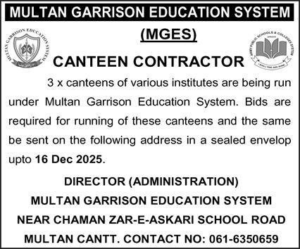 Multan Garrison Education System MGES Jobs 2025 announce the Contract career opportunities for the post of See Below Ad in Punjab, Multan for the fresh and experienced candidates on Contract basis who have Check Advertisement degree. Posted date of this post is 11/12/2025 and the last date is 16/12/2025. if you are eligible for this job apply before due date.