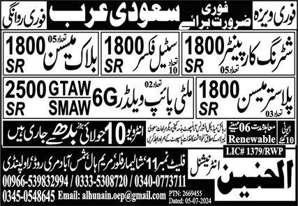 Multi Pipe Welder & Plaster Mason Jobs 2024 announce the Contract career opportunities for the post of See Below Ad in Saudi Arabia for the fresh and experienced candidates on Contract basis who have Check Advertisement degree. Posted date of this post is 09/07/2024 and the last date is 10/07/2024. if you are eligible for this job apply before due date.