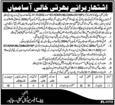 Municipal Committee is looking for candidates for following posts as per job advertisement published in daily Nawaiwaqt Newspaper of November 14, 2022 for location Depalpur, depalpur Punjab Pakistan: sanitary worker