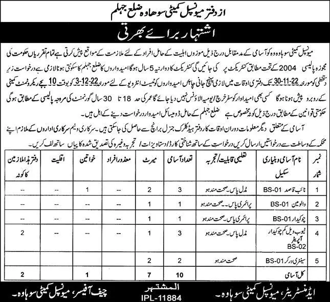 - Municipal Committee MC Sohawa District Jhelum, Local Government & Community Development Department jobs advertisement dated about 18 November 2022 in daily Express Newspaper invites application for the vacant post of naib qasid, sanitary worker, tube well operator and chowkidar in Jhelum, jhelum Punjab Pakistan.