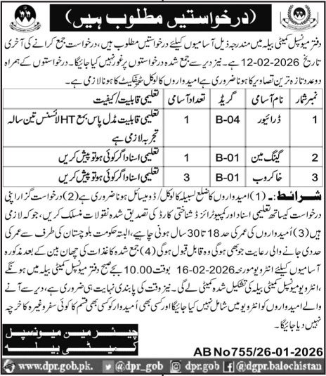 Municipal Committee Bela Jobs 2026 announce the Contract career opportunities for the post of See Below Ad in Balochistan, Bela for the fresh and experienced candidates on Contract basis who have Check Advertisement degree. Posted date of this post is 27/01/2026 and the last date is 12/02/2026. if you are eligible for this job apply before due date.